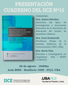 Lxs invitamos a la presentación del Cuaderno del IICE N°15: “Hacia la formación de lectores críticos en las aulas: un proyecto didáctico conjunto de docentes e investigadores”, a cargo de Flora Perelman, Fernanda Aren, Diana Grunfeld, Gabriela Rubinovich, Gabriel Dvoskin, Natalia Sain, Julieta Biscay y Mariela Valloud. La misma se realizará el lunes 25 de agosto, a las 18 hrs., en el aula 905 de la Facultad de Filosofía y Letras, Sede Bonifacio.